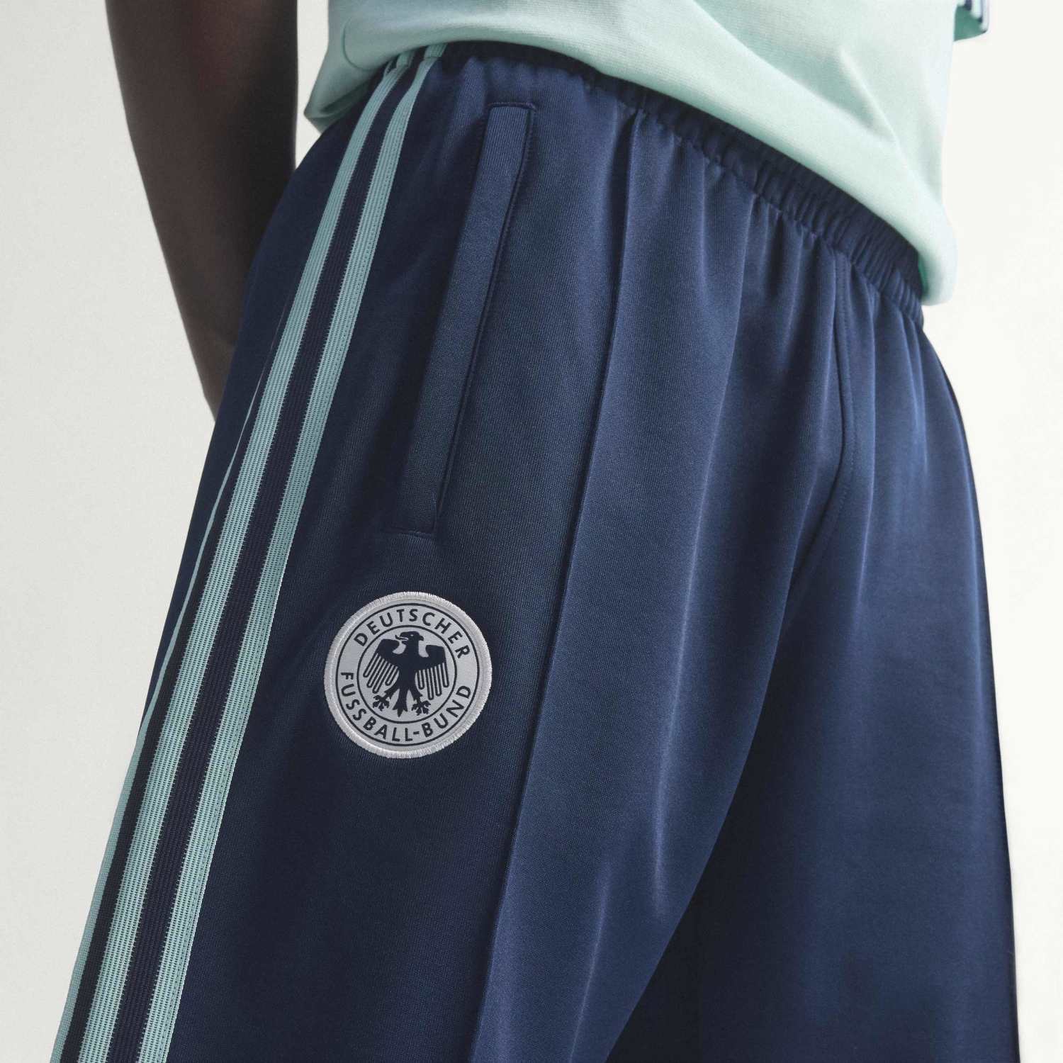 Charakteristisch für das Design sind der durchgehende Frontreißverschluss, der hochschließende Stehkragen sowie die markanten drei adidas-Streifen entlang der Ärmel. Ergänzt wird das Gesamtbild durch das klassische Trefoil-Logo und das DFB-Emblem auf der Brust, wodurch die Verbindung zur deutschen Nationalmannschaft sofort erkennbar wird. Diese Kombination aus Traditionssymbolen und klarer Linienführung macht die Jacke zu einem echten Blickfang für Fans und Modeinteressierte gleichermaßen. Das Modell orientiert sich stilistisch an klassischen Track Jackets, die seit vielen Jahren fester Bestandteil der adidas Originals Kollektionen sind.