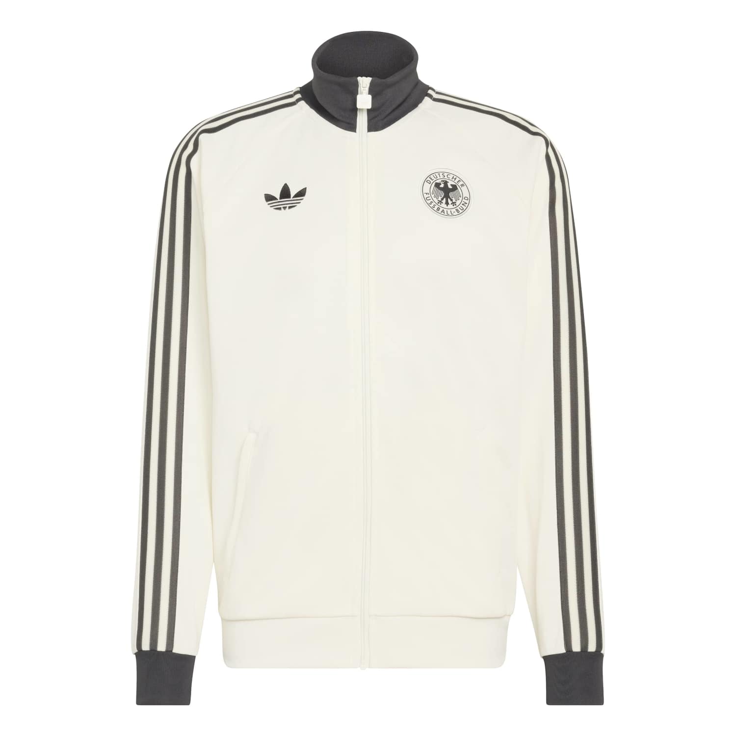 Durch die dezente Off-White-Farbgebung wirkt das Modell besonders hochwertig und lässt sich vielseitig kombinieren – egal ob zu Jeans, Jogginghose oder Sneakern. Die Jacke spricht vor allem Fans an, die sportliche Mode mit Retro-Charakter und DFB-Tradition schätzen